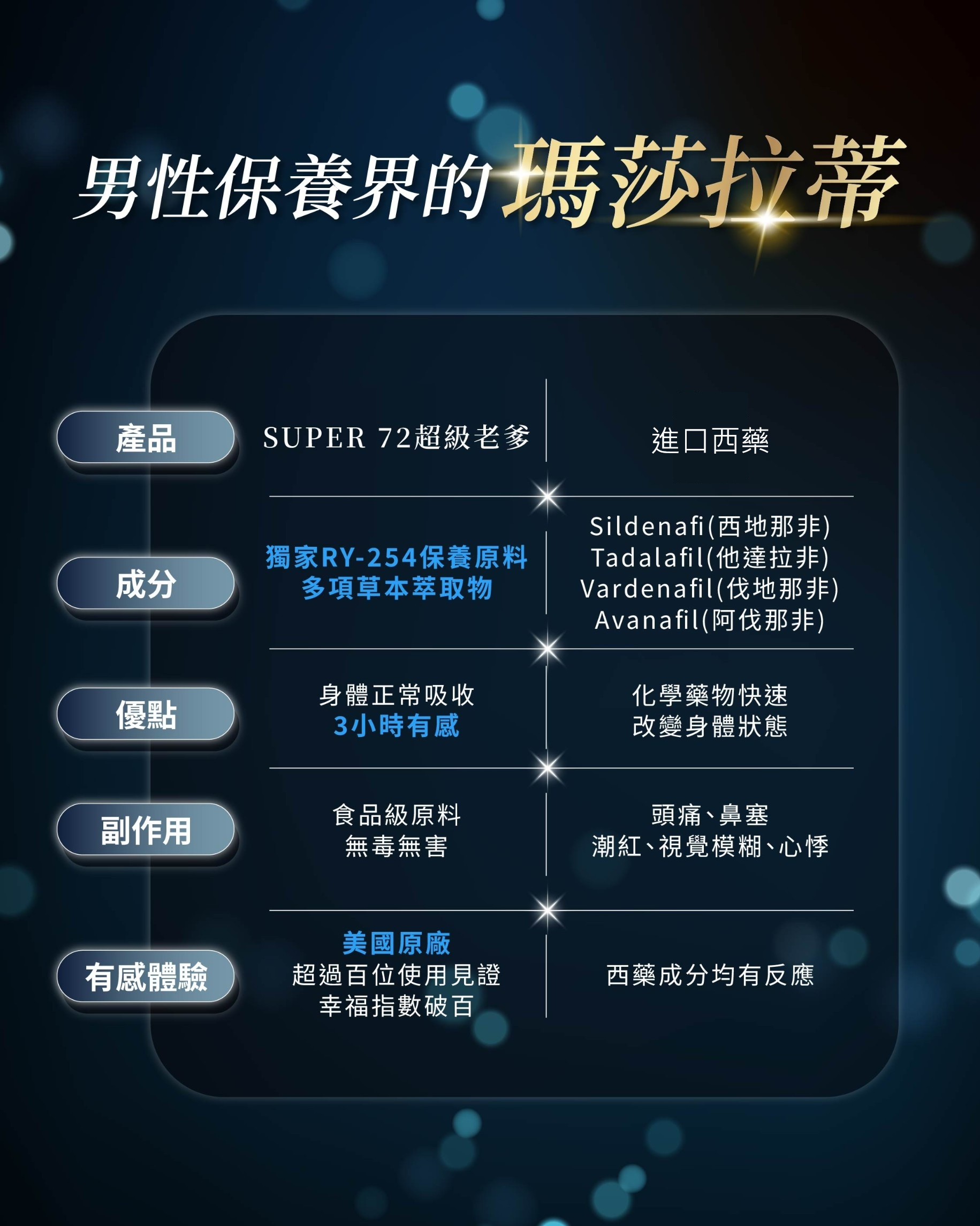 Super 72 採用食品級草本原料製成,並透過第三方公正單位(SGS)檢驗,確認未檢出西藥成分、未檢出壯陽藥物,亦未檢出壯陽類緣物等相關物質,品質與安全性皆有保障。